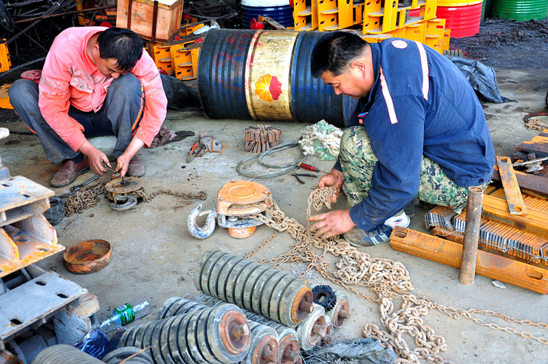 圖為煤三項(xiàng)目部機(jī)電隊(duì)職工正在對(duì)損壞的滑子進(jìn)行修復(fù)。