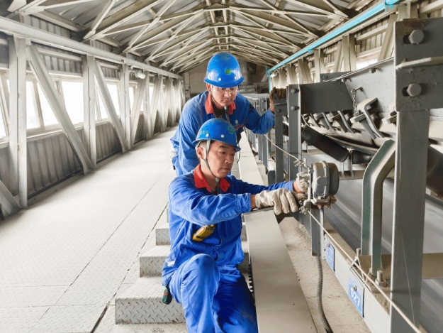 在喂料皮帶機現(xiàn)場,淮北礦業(yè)集團2024年度勞動模范張明飛正帶領徒弟對屬地帶式輸送機進行安全排查。(撰稿:馮慧、張洋洋 審核:王士峰)