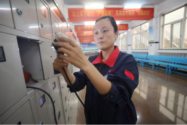 圖為在該礦燈房大廳,一名維修工檢查礦燈完好情況。