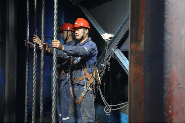 圖為該礦兩名職工正在對主井鋼絲繩進行檢修。
