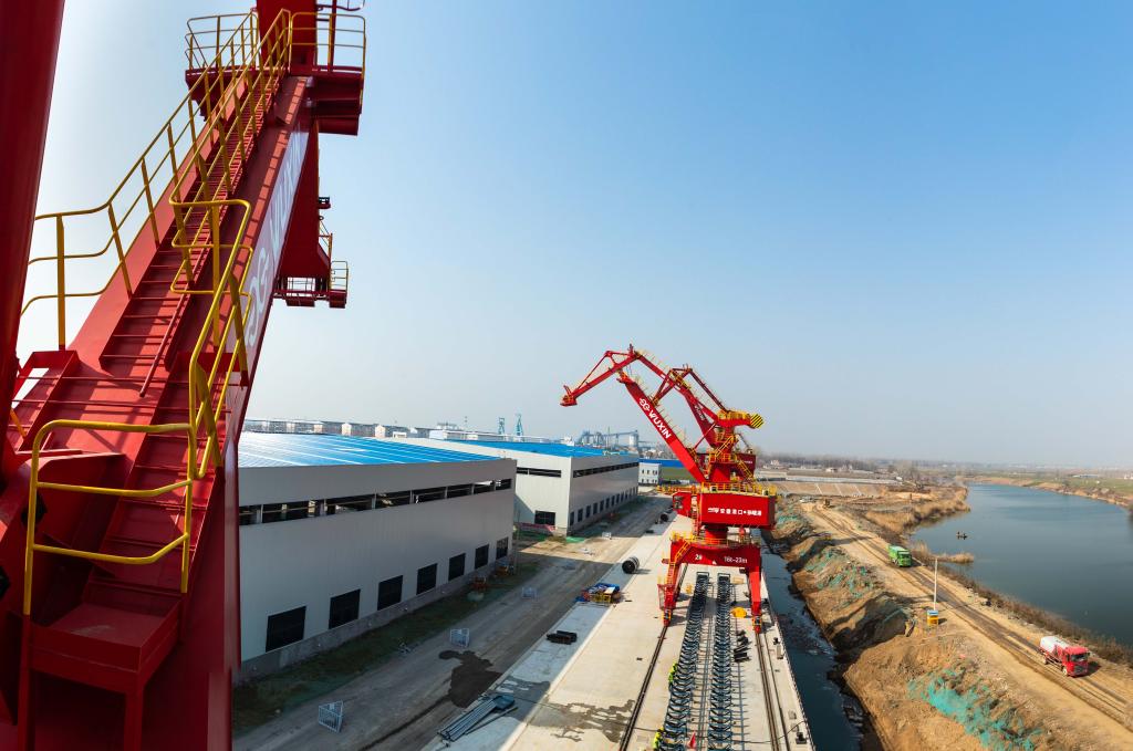 1月31日,淮北港孫疃碼頭工程建設現場,起重機、多用途門機、移動式裝船機等一臺臺大型港機設備傲然屹立在澮河岸邊,施工人員正在為設備的聯調聯試作準備。