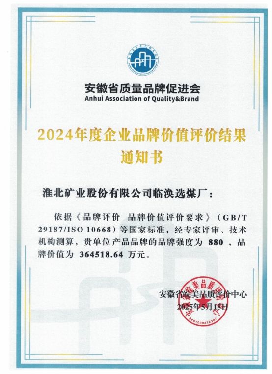 近日,在安徽省品牌促進會官網發布的2024年度安徽省企業品牌價值評價信息中,臨渙選煤廠以“品牌強度880,品牌價值36.4億元”摘得產品品牌類的桂冠。